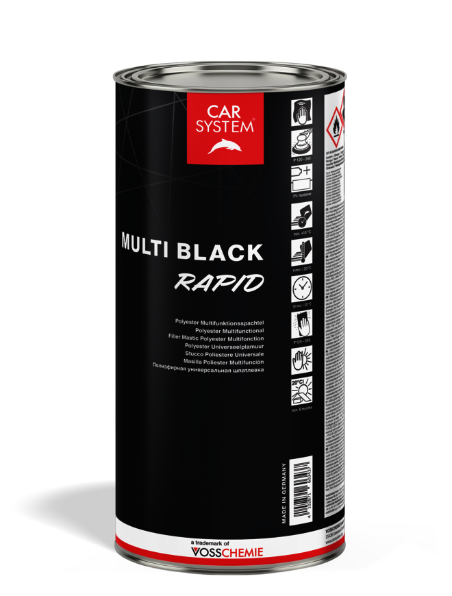 The Carsystem Multi Black Rapid is a polyester multifunctional putty with a drying time of 10 min / 20 °C object temperature. The Carsystem Multi Black Rapid has no surface moisture after curing. Because of the latest filling agents it has an improved sandability.