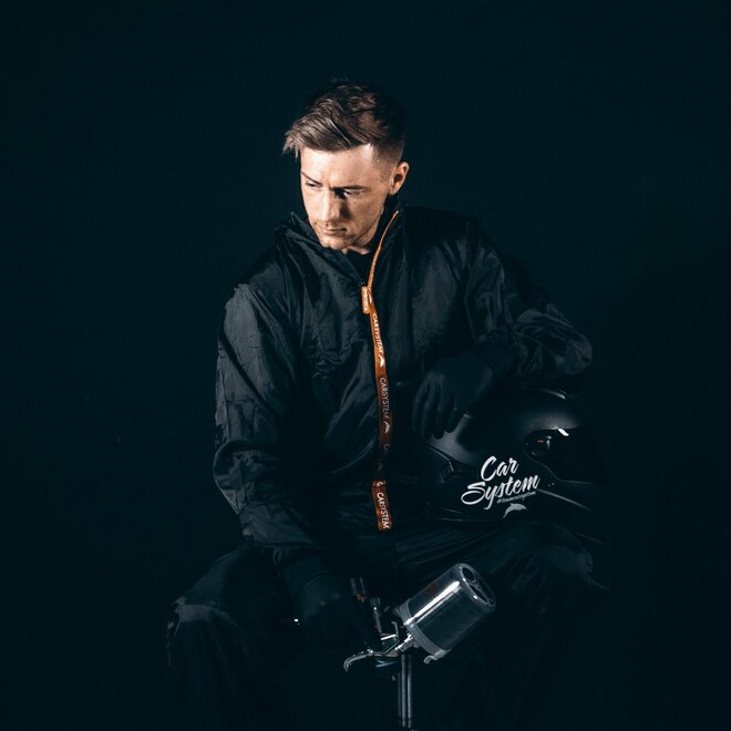 Het De Carsystem Black Suit-spuitoverall is een beschermende overall gemaakt van 99% nylon en 1% carbon. Het heeft de beschermingsklasse PSA Cat I, is wasbaar tot 30 °C, siliconen-, stof- en pluisvrij. Het heeft een antistatische coating (EN 1149-3:2004). Ons model is 1,85 m lang en draagt maat L.